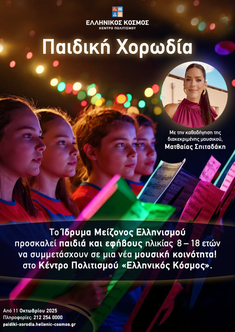 Η χορωδία του Ιδρύματος Μείζονος Ελληνισμού καλεί παιδιά και εφήβους ηλικίας από 8 έως 18 ετών, που αγαπούν τη μουσική να γίνουν μέρος μιας ζωντανής κοινότητας ήχου, έκφρασης και χαράς με την καθοδήγηση της μουσικοπαιδαγωγού Ματθαίας Σπιταδάκη. Στη συνοδεία του πιάνου θα είναι