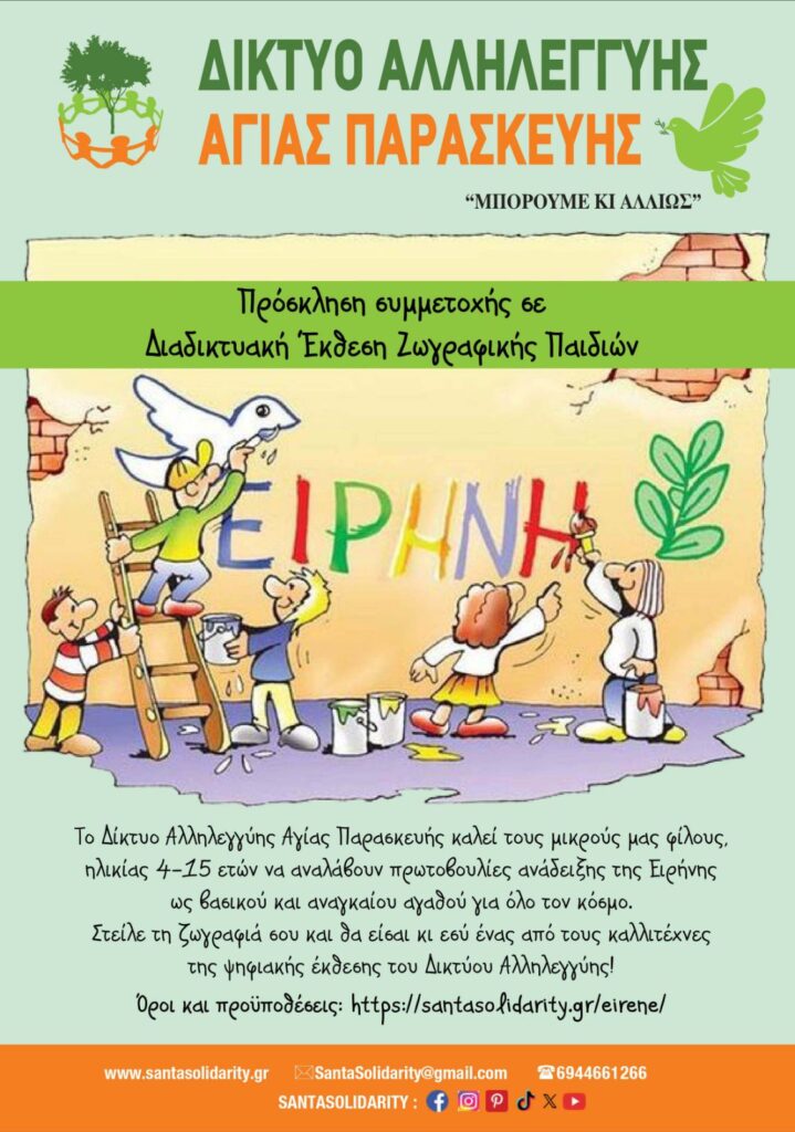 Πρόσκληση συμμετοχής σε Ψηφιακή Έκθεση Ζωγραφικής Παιδιών Το Δίκτυο Αλληλεγγύης Αγίας Παρασκευής καλεί τους μικρούς μας φίλους, ηλικίας 4-15 ετών να αναλάβουν πρωτοβουλίες ανάδειξης της Ειρήνης ως βασικού